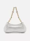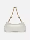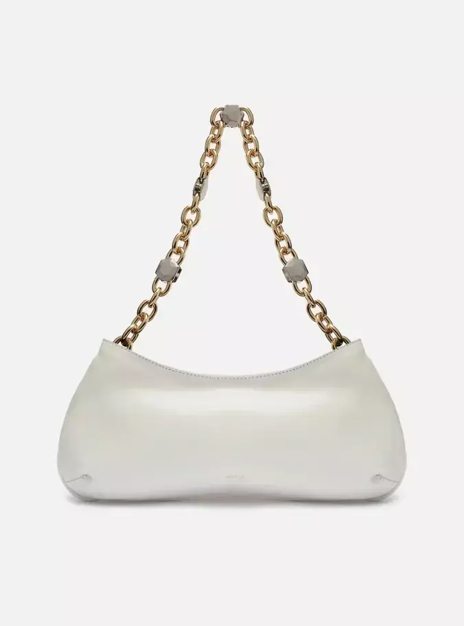 Descrição: Bolsa tiracolo média branca de couro. O modelo tem formato retangular e alongado e laterais arredondadas. Traz alça lateral ou de ombro em corrente com detalhes em metais geométricos e pedrarias. Com fecho superior.