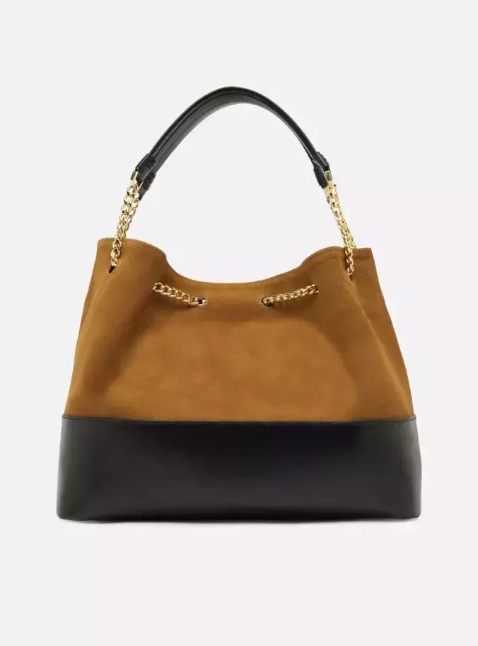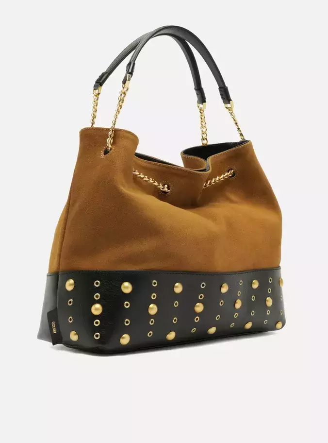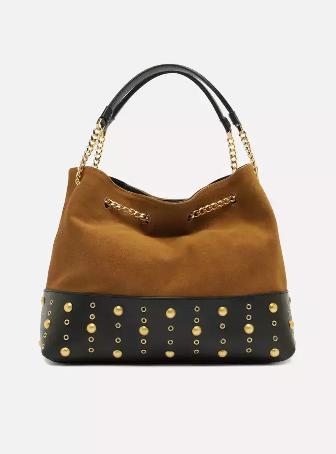 Descrição: Bolsa bucket grande em couro acamurçado marrom. O acessório tem formato estruturado e faixa em couro liso preto na parte inferior da capa, com aplicação de semi esferas douradas e ilhoses. Traz alça de ombro em corrente metálica e ombreiras de couro, transpassada na borda superior. Possui fecho em imã interno.