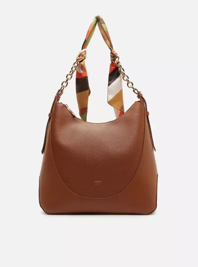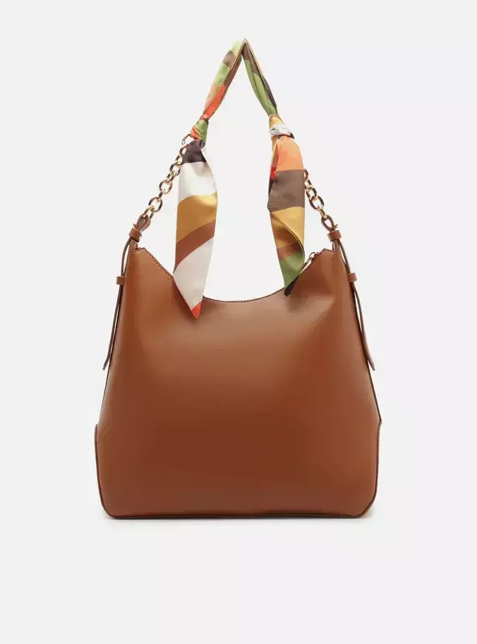 Descrição: Bolsa hobo grande marrom. O acessório tem formato estruturado e acabamento texturizado. Traz moldura lisa e curva na base, além de alça contínua em corrente metálica dourada que abre no centro. A bolsa pode ser usada de duas formas: apenas com a corrente metálica ou com o lenço estampado que acompanha o modelo, amarrado à alça. Possui fecho superior em zíper com puxador.