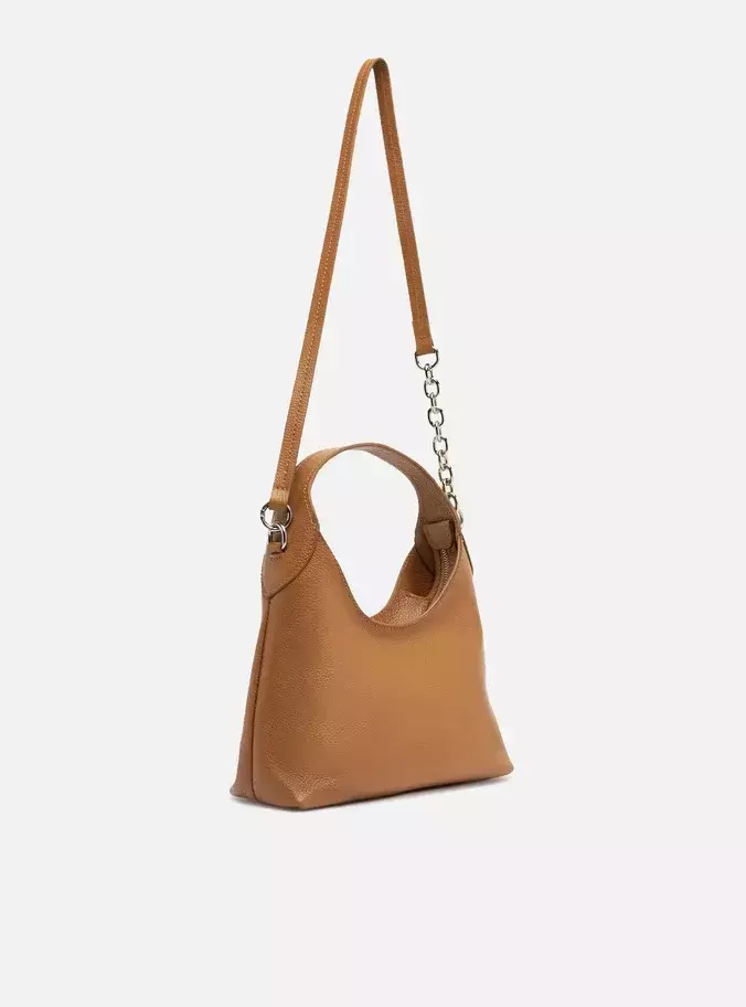 Descrição: Bolsa tiracolo média em couro marrom. O acessório tem formato retangular e acabamento macio. Traz alça de mão larga e contínua ao corpo da bolsa, além de alça lateral em tira e corrente metálica. Possui fecho em zíper e puxador.