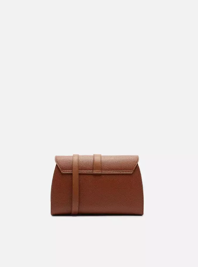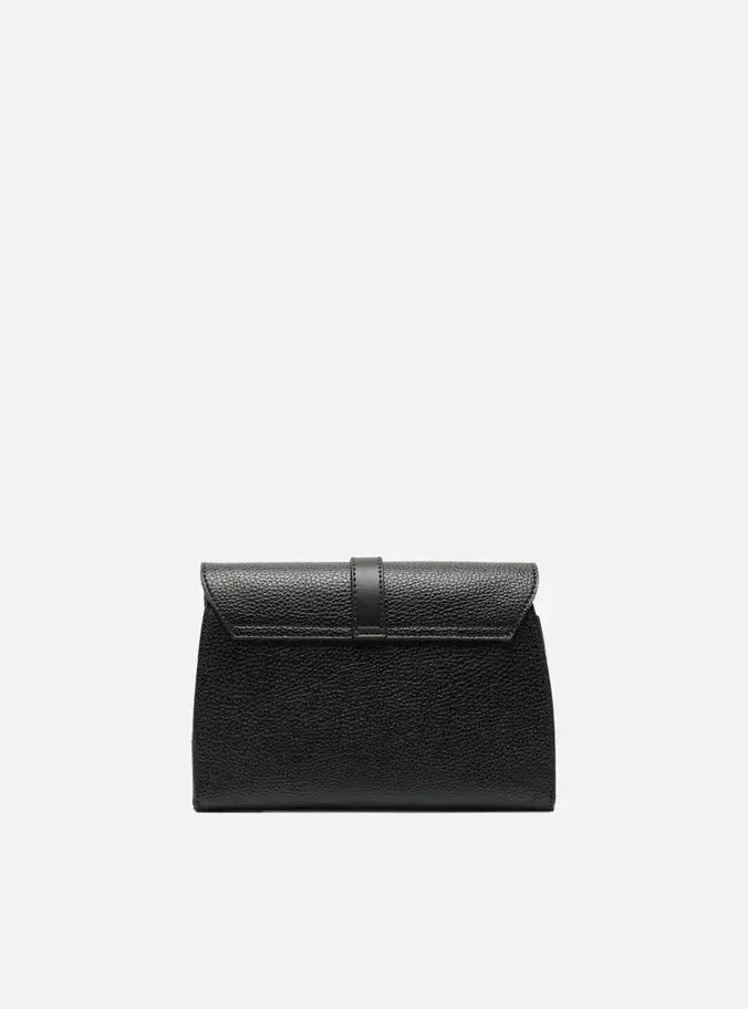 Descrição: Bolsa tiracolo pequena preta. O acessório tem formato estruturado, acabamento texturizado e inscrição discreta do nome da marca. Traz alça tiracolo regulável. Possui fecho em tampo frontal com detalhe de tira, peça de metal e mais duas tiras finas com ponteiras de argola presas.