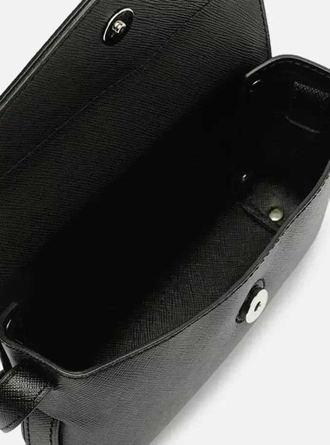 Descrição: Bolsa tiracolo pequena preta. O acessório tem formato retangular e laterais arredondadas. Traz alça fina, transpassada nas laterais com recortes, e fecho em tampo frontal e imã. Com inscrição discreta do nome da marca na capa e rebites na parte traseira.