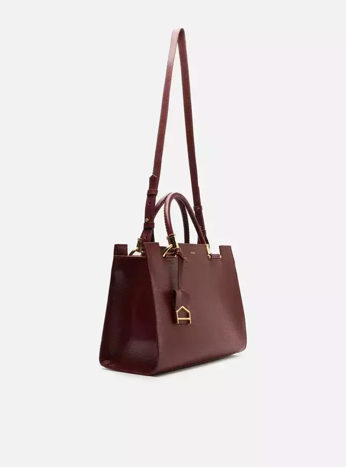 Descrição: Bolsa tote grande de couro preta. O modelo tem formato estruturado, capas com acabamento texturizado e recorte geométrico na parte superior. Traz alça tiracolo larga regulável e alças de mão bombadas com ilhós metálicos sextavados. Possui fecho superior em zíper e puxador. Com bag charm em couro liso, peça de metal e tira fina presa à alça.