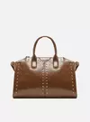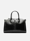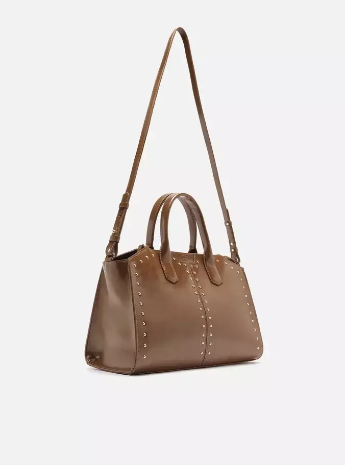 Descrição: Bolsa tote grande confeccionada em material sintético com acabamento brilhoso em verniz. Possui rebites metálicos aplicados ao redor, forro interno acinzentado e amplo espaço interno. O modelo combina estrutura elegante com design funcional, ideal para acompanhar diferentes momentos da rotina.