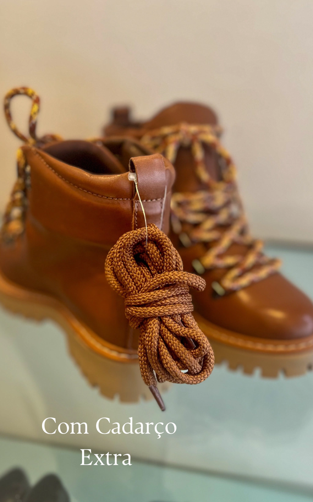 Descrição: O coturno tratorado é um clássico! Sua sola emborrachada e com ranhuras garante uma pegada bem utilitária e urbana. Surge atualizado com inspiração trekking. Bota coturno de couro marrom feminina. O sapato tem cano curto, salto baixo bloco e formato arredondado na ponta. Possui base emborrachada tratorada bege, bipartida, além de vira no contorno superior em costura pesponto. Traz tira como puxador no calcanhar e fecho em amarração por cadarços coloridos, com passadores metálicos, cobrindo todo o cano.