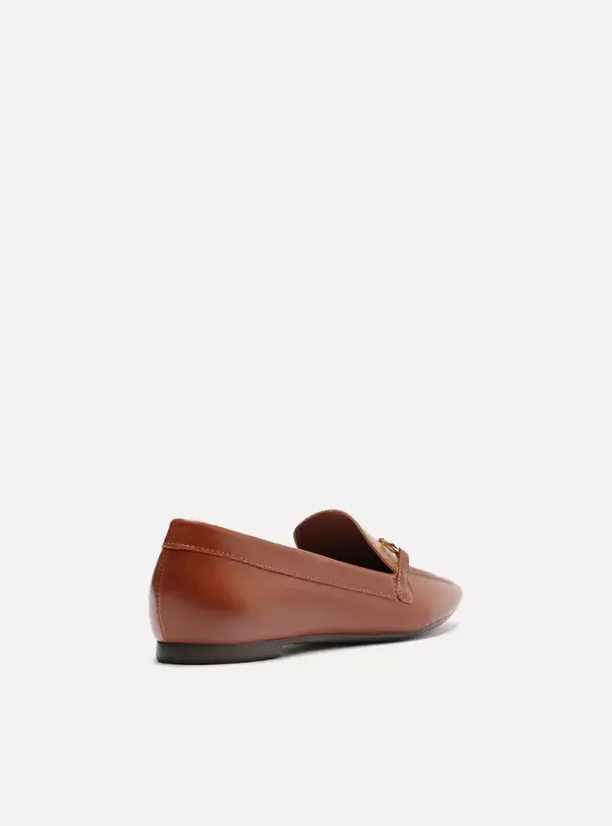 Descrição: Mocassim feminino marrom de couro. O sapato tem salto rasteiro e formato quadrado na ponta. Fechado, traz recorte lateral na gáspea e aplicação de bridão metálico dourado, preso por tiras, sobre o cabedal. Possui costura marcada no contorno da biqueira. Com palmilha bege e inscrição do nome da marca, exibe toda a parte superior do pé.