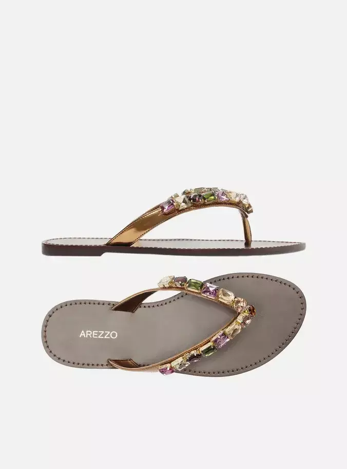 Descrição: Rasteira bronze. O sapato tem sola flat e formato arredondado na ponta. Traz tiras finas dividindo os dedos com aplicação de pedrarias. Com palmilha lisa marrom, costuras pesponto por todo o contorno e inscrição do nome da marca. Aberta, exibe todo o pé.