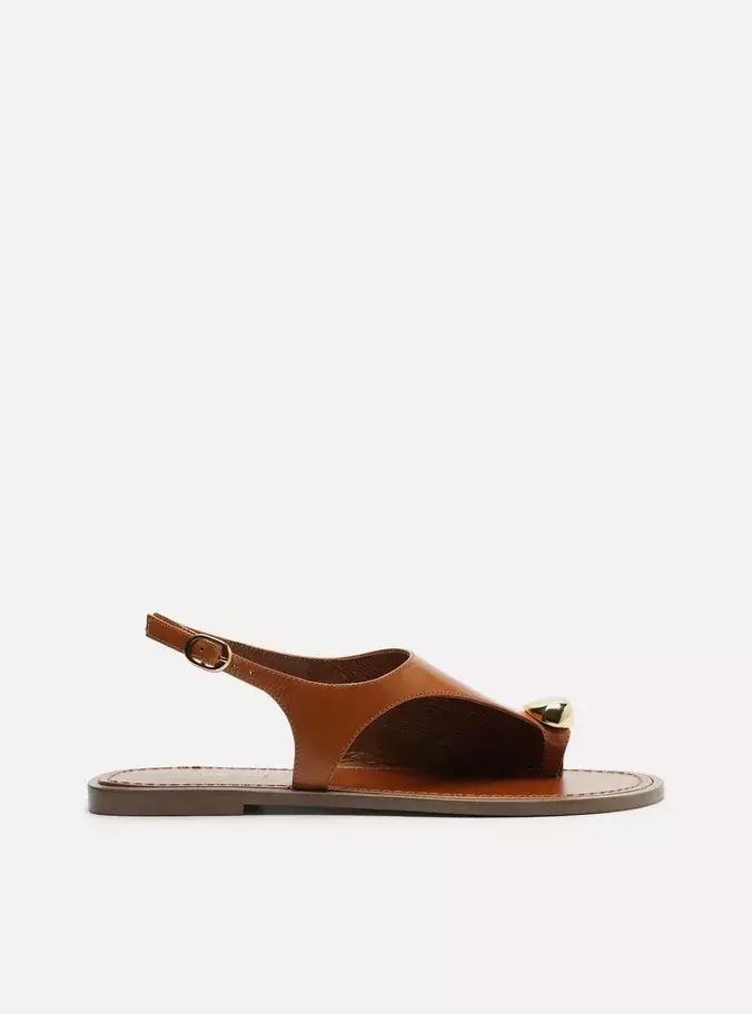 Descrição: Sandália feminina marrom de couro. O sapato tem salto rasteiro e formato arredondado na ponta. Traz cabedal semi fechado, com recorte que divide os dedos, estilo dedeira, com aplicação de metal dourado, espesso e orgânico. Possui tira fina conectada ao cabedal, com fecho em fivela metálica lateral. Com palmilha de recouro marrom e nome da marca.