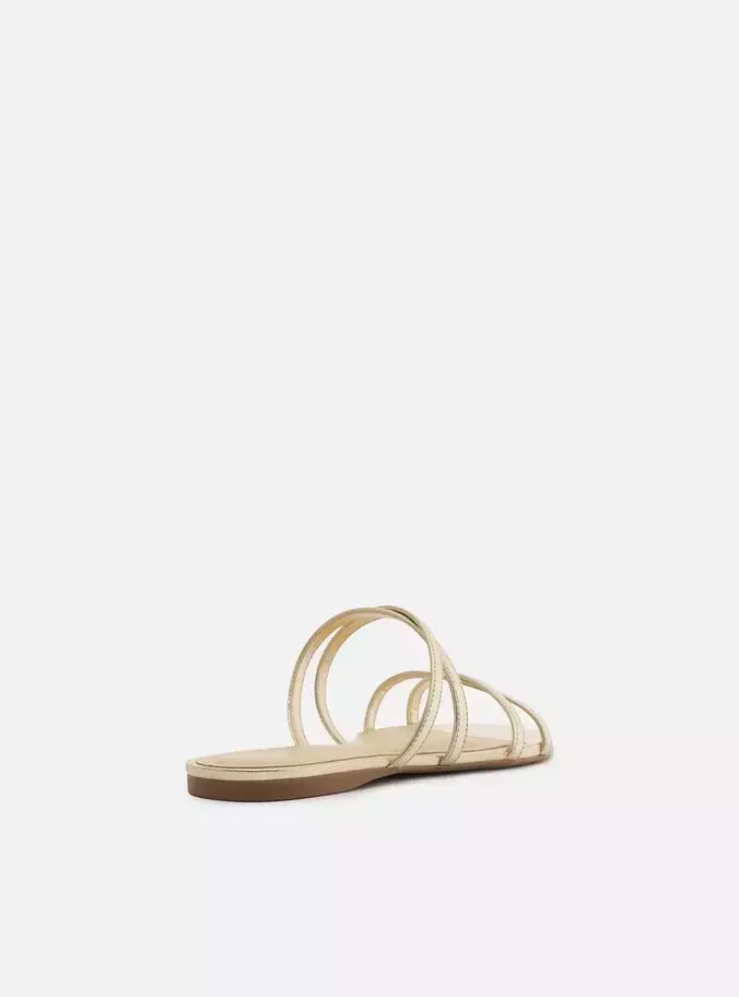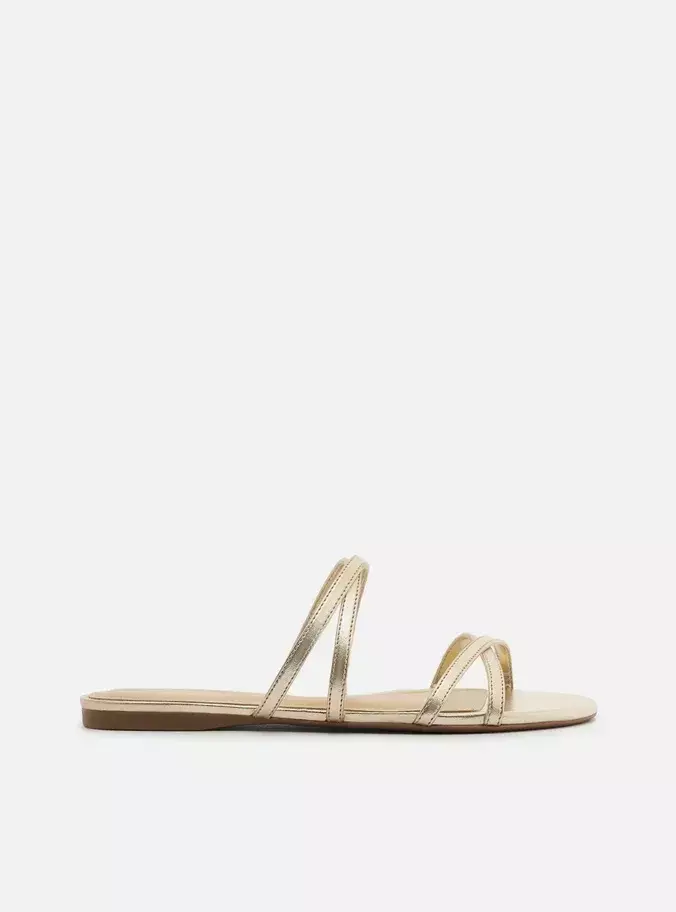 Descrição: Sandália rasteira feminina dourada. O sapato tem sola flat, duas tiras finas cruzadas sobre os dedos e mais duas na parte superior do pé. Com formato arredondado na ponta, é aberta e exibe todo o pé. Com base emborrachada, palmilha lisa bege e inscrição do nome da marca.