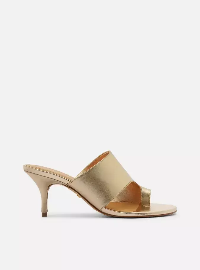 Descrição: Sandália feminina bege em couro. O sapato tem salto médio fino e formato arredondado na ponta. Traz cabedal largo e liso que cobre parcialmente a parte superior do pé, deixando os dedos e o calcanhar à mostra, e com recorte que divide os dedos, estilo dedeira. Com palmilha bege e inscrição do nome da marca.