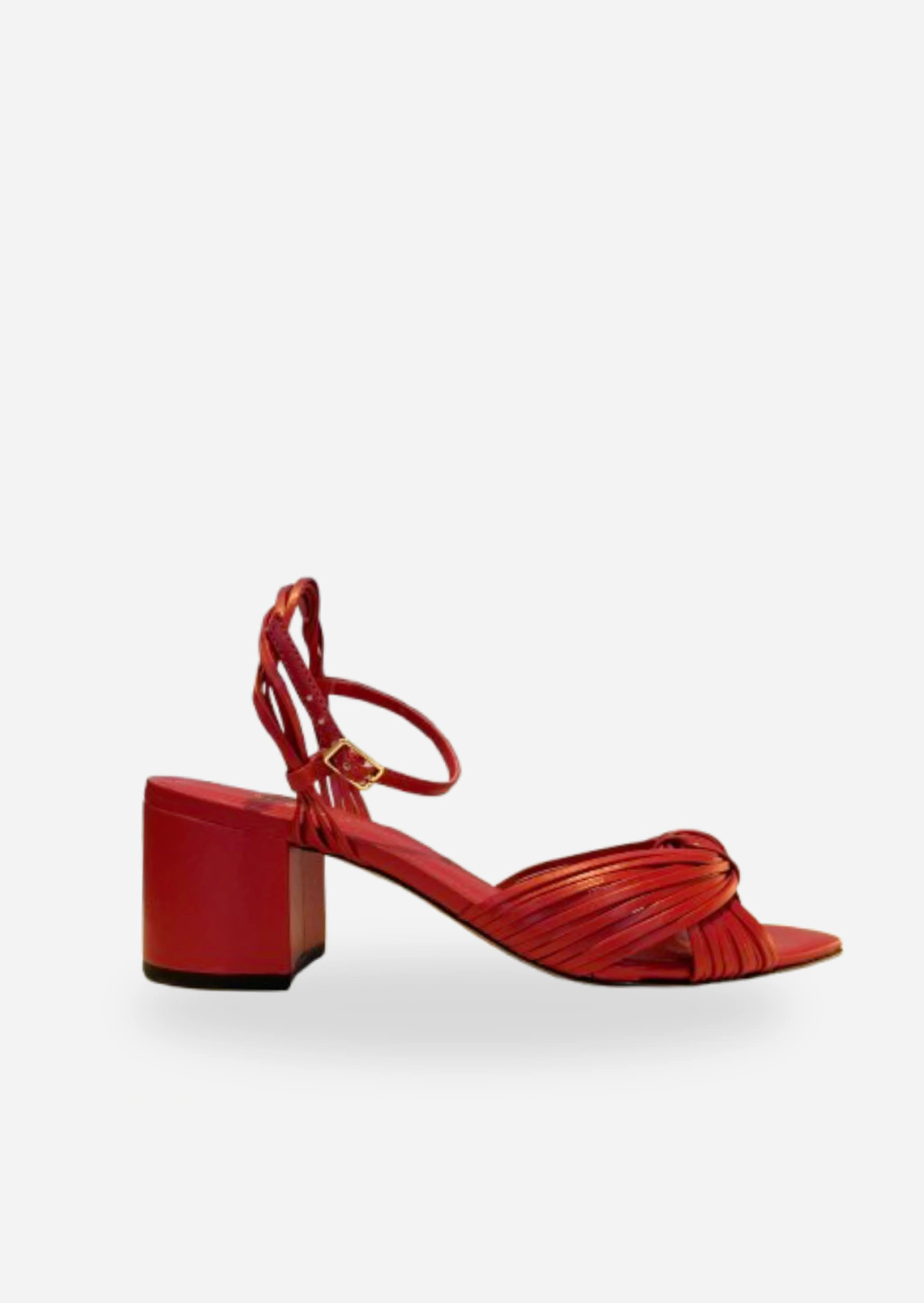 Descrição: Sandália feminina. O sapato tem salto médio bloco e formato folha na ponta. Traz tiras finas em conjuntos, cruzadas e formando um nó sobre os dedos - nas cores dourado, vermelha. Possui tiras finas no calcanhar e tira no tornozelo que fecha em fivela lateral. Com palmilha da cor da sandália e inscrição do nome da marca.