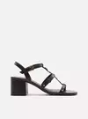 Descrição: Sandália feminina marrom de couro. O sapato tem salto médio bloco e formato arredondado na ponta. Traz tira sobre os dedos, duas tiras horizontais e tira na parte central, com rebites e metais diversos. Possui tira no calcanhar, também com aplicações, e fecho em fivela lateral. Com palmilha lisa da cor da sandália e inscrição do nome da marca. A sandália exibe todo o pé.