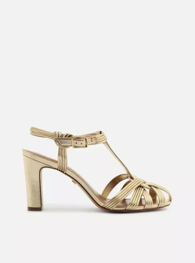 Descrição: Sandália feminina dourada. O sapato tem salto médio bloco e formato arredondado na ponta. Traz conjunto de tiras finas na parte frontal, unidas por enlace, além de tira vertical que sobe pela parte superior do pé. No tornozelo, conecta-se a tira com fecho em fivela lateral, adornada por detalhe em nó. Com palmilha marrom e inscrição do nome da marca.