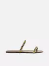 Aposta Certa: A rasteira com pedrarias coloridas adiciona brilho e personalidade às produções. O design delicado e vibrante traduz o mood festivo da temporada, criando um toque sofisticado para os looks de verão.