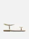 Descrição: Sandália rasteira dourada. O sapato tem sola flat e formato arredondado na ponta. Traz tira fina que divide os dedos, estilo dedeira, com aplicação de peça metálica dourada em formato de estrela do mar. Possui tira fina que envolve o tornozelo com fecho em fivela metálica lateral. Com palmilha marrom e inscrição do nome da marca. Aberta, exibe todo o pé.