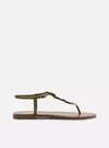 Descrição: Sandália rasteira verde em couro. O sapato tem sola flat e formato arredondado na ponta. Traz tira central composta por peças redondas em trama, que divide os dedos. Possui tira fina em torno do tornozelo com fecho lateral em fivela metálica. Com palmilha marrom lisa, contorno em pesponto e inscrição do nome da marca. Aberta, exibe todo o pé.