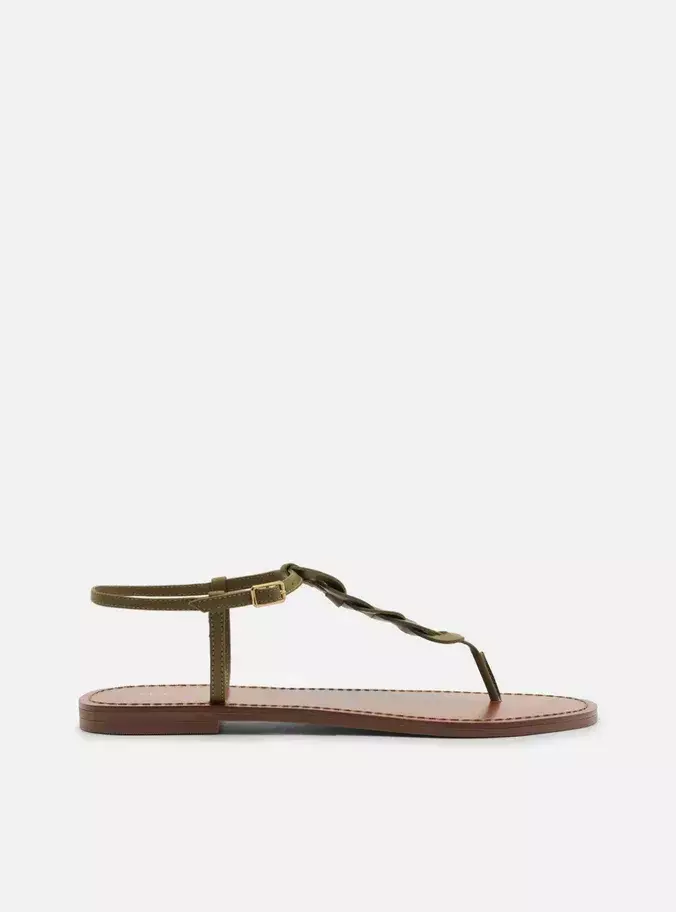 Aposta Certa: A sandália rasteira em couro traz leveza e estilo ao visual. O trabalho tramado na tira central adiciona um toque artesanal, enquanto o tom verde garante modernidade. Ideal para produções de verão que unem conforto e sofisticação.