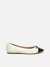 Descrição: Sapatilha Off-white. O modelo tem salto rasteiro e bico quadrado. Traz cabedal com recorte arredondado sobre o peito do pé. Fechada, possui biqueira preta em verniz e aplicação de laço pequeno, além de inscrição metálica em alto-relevo do nome da marca.