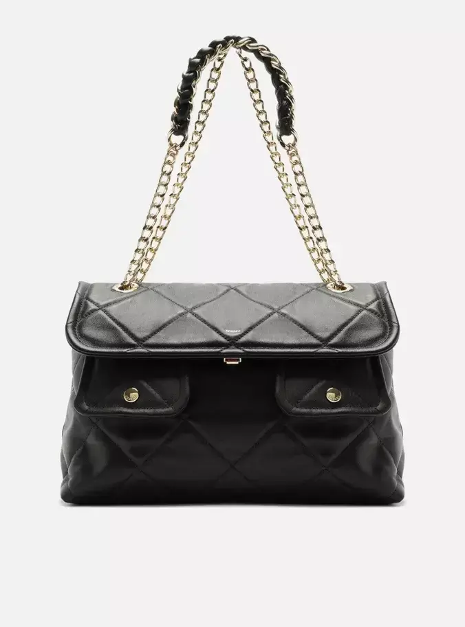 Descrição: Bolsa feminina shoulder grande preta de couro. O acessório tem formato estruturado e acabamento em matelassê. Traz alça de ombro curta em corrente metálica com tira de couro entrelaçada. O fecho é em tampo frontal. Conta com bolsos sob o tampo e fecho em botões.