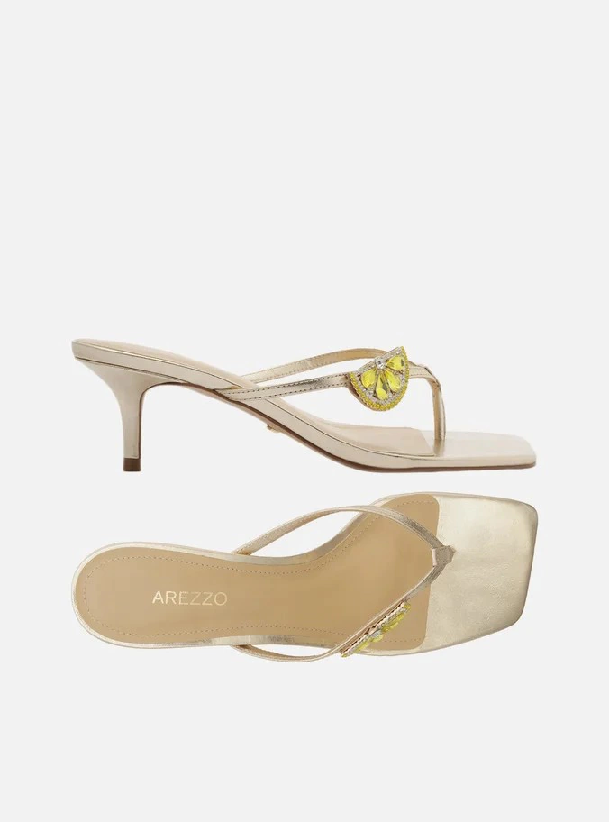 Aposta Certa: A sandália thong ou flip-flop possui um design minimalista e é mega tendência na temporada. Cria looks descolados e tem detalhe de limão cravejado, remetendo à bebida Limoncello, licor feito da fruta e produzido na Itália. Aposte!